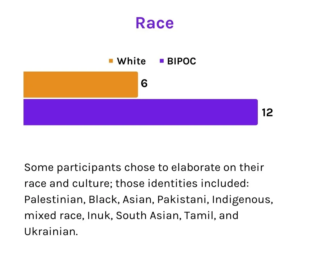 We conducted 18 interviews with youth who identified themselves as 2SLGBTQIA+ and/or BIPOC/racialized and were between the ages of 17 and 30. All participants were given the opportunity to self identify with their choice of words, including sharing any identities that they felt important to them and relevant to our conversation.